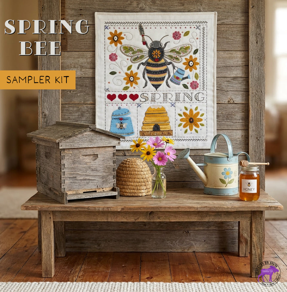 Use embroidery and applique to create this Spring Bee sampler for yourself, or stitch and give to friends or family members. Use felt or felted wool and add your own unique touches to make this a truly cherished heirloom piece.